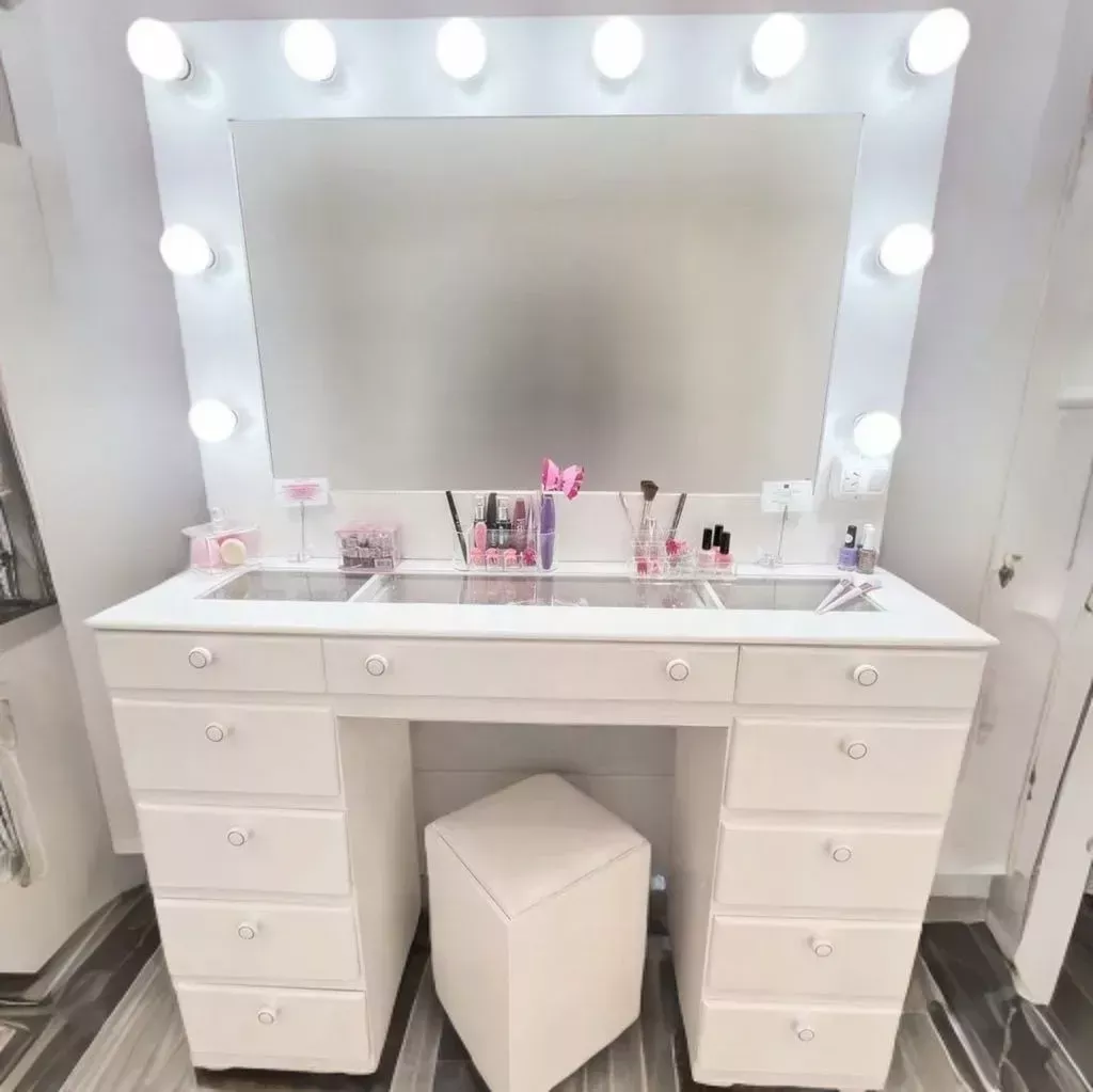 MESA/ESCRITORIO TAPA VIDRIO CON 2 CAJONERAS LATERALES+ ESPEJO ESTILO HOLLYWOOD + ASIENTO PUFF BAULERA